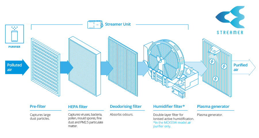 A Daikin légtisztítók hatékonysága a nagyteljesítményű elektrosztatikus HEPA-szűrő és a Daikin által szabadalmaztatott Flash Streamer technológia kombinációjának köszönhető; a HEPA szűrő foglyul ejti a vírust, ezt követően a Streamer plazmakisülés megsemmisíti azt.
