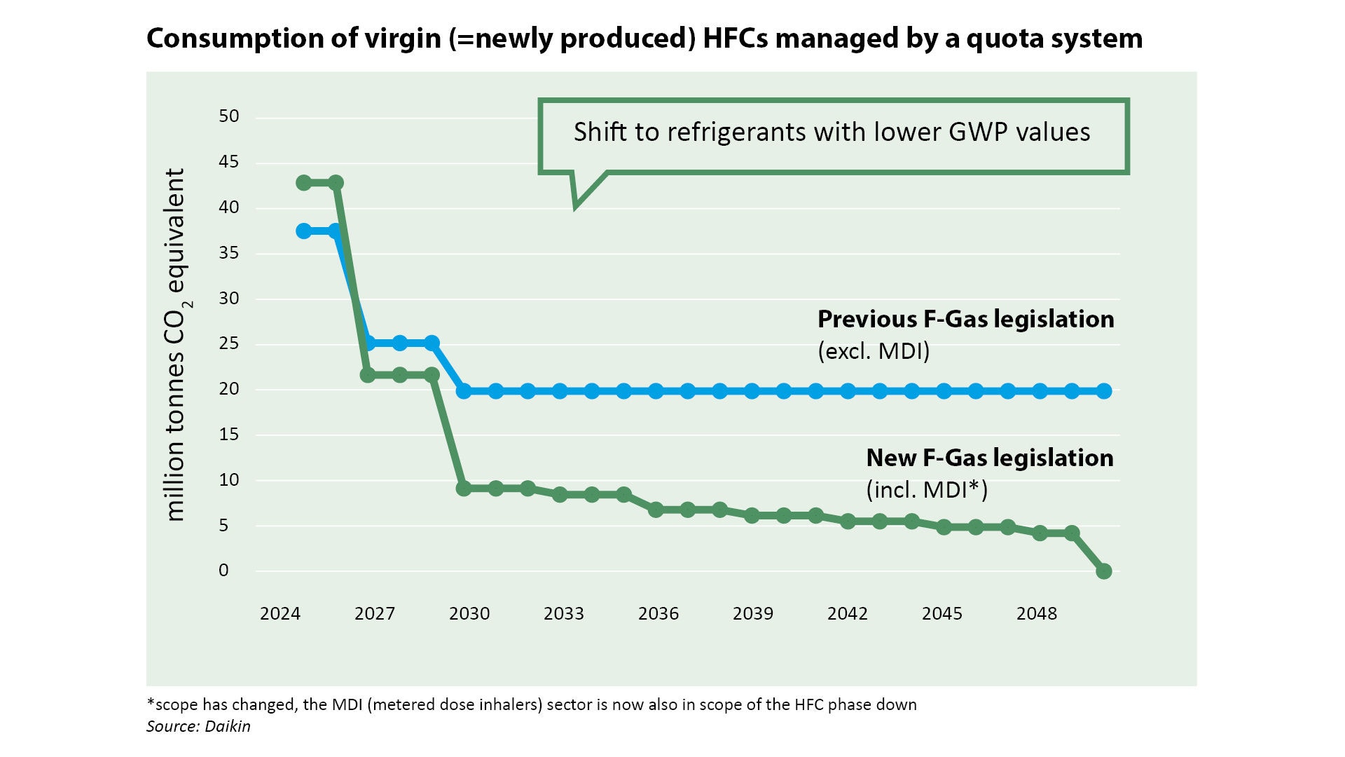 Az újonnan előállított HFC-k CO2-egyenértékben kifejezett engedélyezett felhasználásának összehasonlítása a 2014. évi EU 517/2014 F-gázrendelet és az aktualizált EU 2024/573 F-gázrendelet között. © Daikin